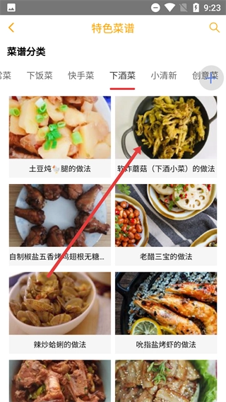 2、进入【特色菜谱】页面后,在【菜谱分类】中选择【下酒菜】标签,切换到下酒菜类别的菜谱列表。