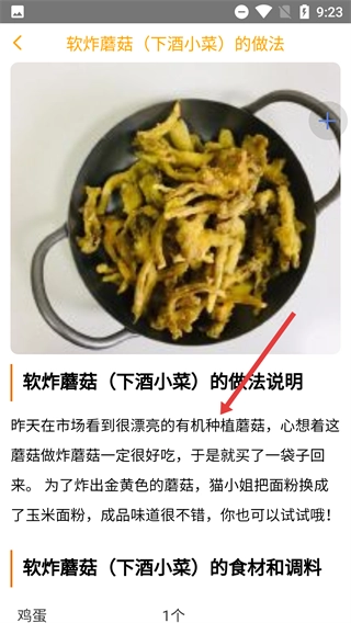 4、进入【软炸蘑菇(下酒小菜)的做法】详情页,可查看该菜品的【做法说明】及【食材和调料】等内容。