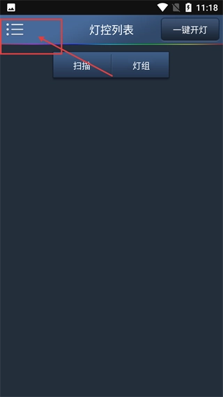 2、在【灯控列表】页面,点击左上角的菜单按钮可展开功能菜单,页面还支持【扫描】【灯组】【一键开灯】等操作。