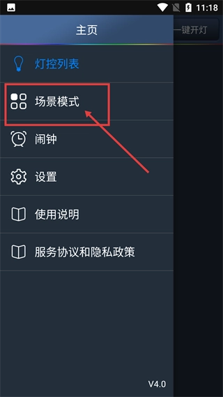 3、展开功能菜单后,点击【场景模式】选项,即可进入对应的场景模式设置页面,菜单还包含【闹钟】【设置】等功能。