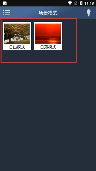 4、进入【场景模式】页面后,可选择【日出模式】或【日落模式】,对应切换灯光的场景效果,完成灯光场景的快速设置。