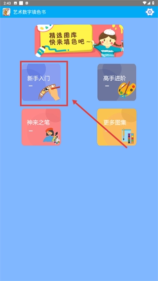 1、在主页面找到并选择“新手入门”分类,进入该分类对应的填色图库页面后,就能挑选基础图案开展填色练习。