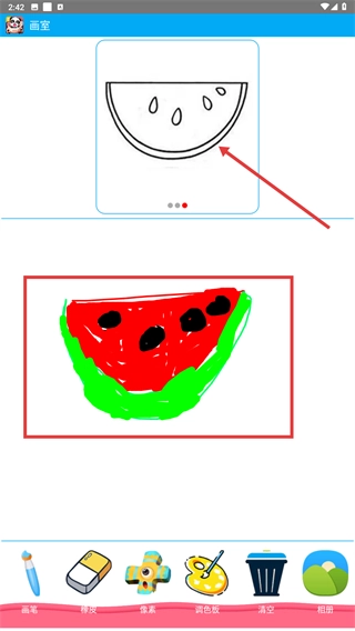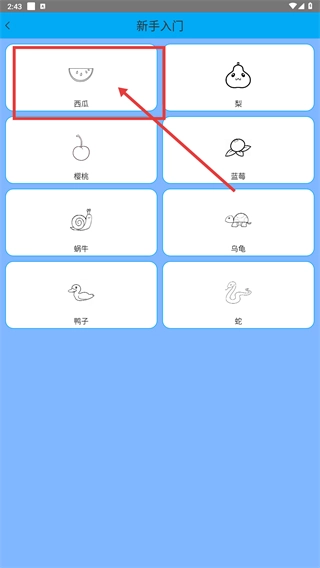 2、在新手入门图库,点击目标图案(如西瓜),进入该图案的填色画室界面。