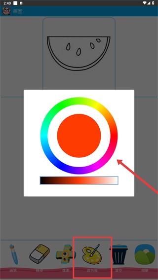 3、在画室里,点击底部【调色板】,通过色轮选择所需颜色,完成填色的色彩设置。