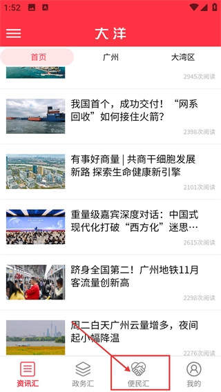 1、在【大洋】的资讯展示页面底部,导航栏中设有【便民汇】功能入口,点击该入口即可切换至便民服务模块,从而获取各类生活服务。