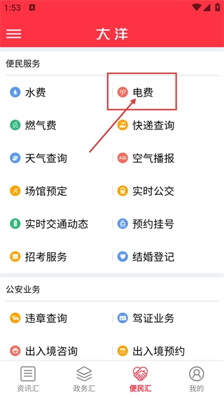 2、进入【便民汇】的便民服务页面后,可见【电费】-【水费】-【燃气费】等服务选项,点击【电费】即可进入对应的服务操作界面。