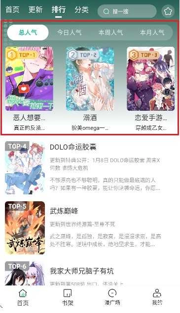 4、排行榜板块设有多个维度的榜单,涵盖总人气榜、日榜、周榜与月榜,能帮助你了解当下热门作品的发展趋势。
