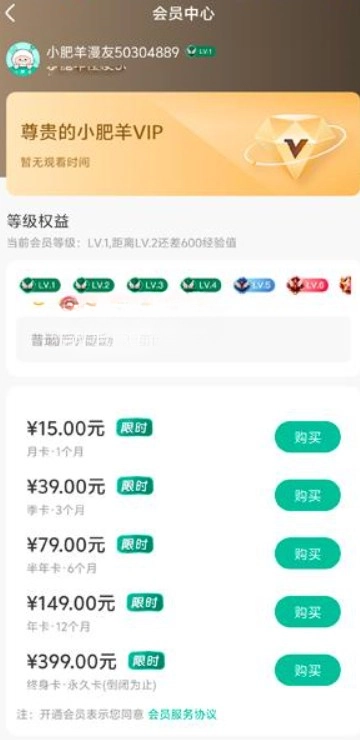 3、浏览可选的会员套餐,挑选合适的类型后点击购买,完成支付就能享受会员专属权益。