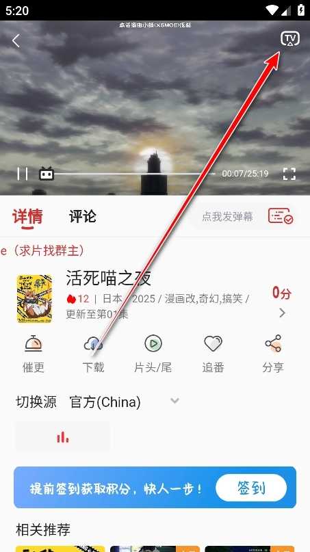 4. 在播放页面的右上角点击“tv”图标就能启动投屏。