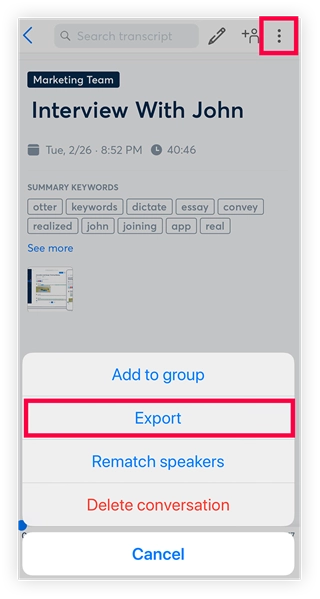 点击详细信息屏幕右上角的图标,即可打开“导出”菜单。语音与文本数据均支持导出操作。其中,文本数据可导出为TXT文件、剪贴板(复制至剪贴板)、DOCX文件、PDF文件或SRT文件。需要注意的是,DOCX、PDF和SRT文件格式仅对高级用户开放使用。