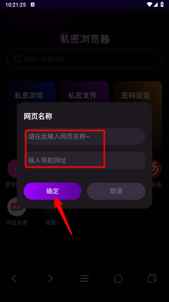 3、然后输入网页名称和网址,点击"确定"。