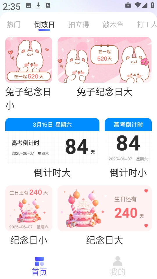 2、首页包含了倒数日,拍立得,敲木鱼,打工人等多种风格的小组件。