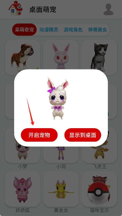 3、我们再次点击宠物并在弹窗中点击“开启宠物”按钮。