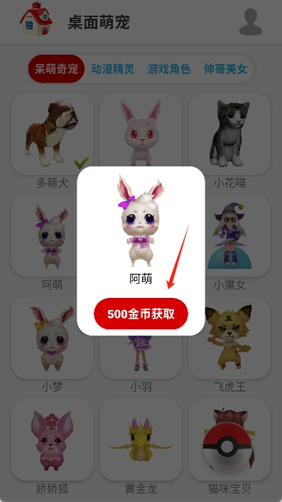 2、确定选择后,点击宠物并在弹窗中点击获取按钮。