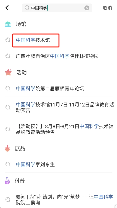 2、然后在搜索结果中找到对应的科技馆,点击进入详情页面。