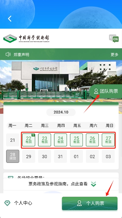 5、在预约页面中选择计划参观的日期,并根据个人情况选择票种购买方式(个人购票或团体购票)。