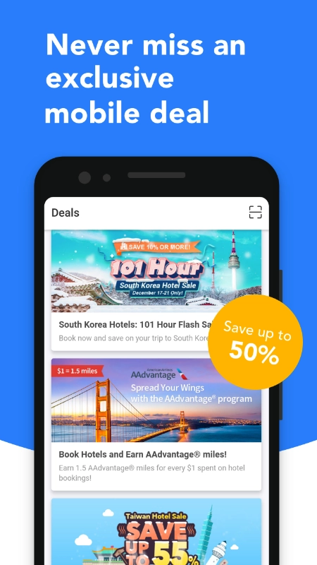 ● 输入城市、地标、酒店名称或所在位置,搜寻高达50%特价酒店。