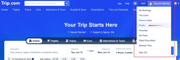 6、注册成功后,点击页面上方的“trip.com member”,并点击“profile”进入个人中心。