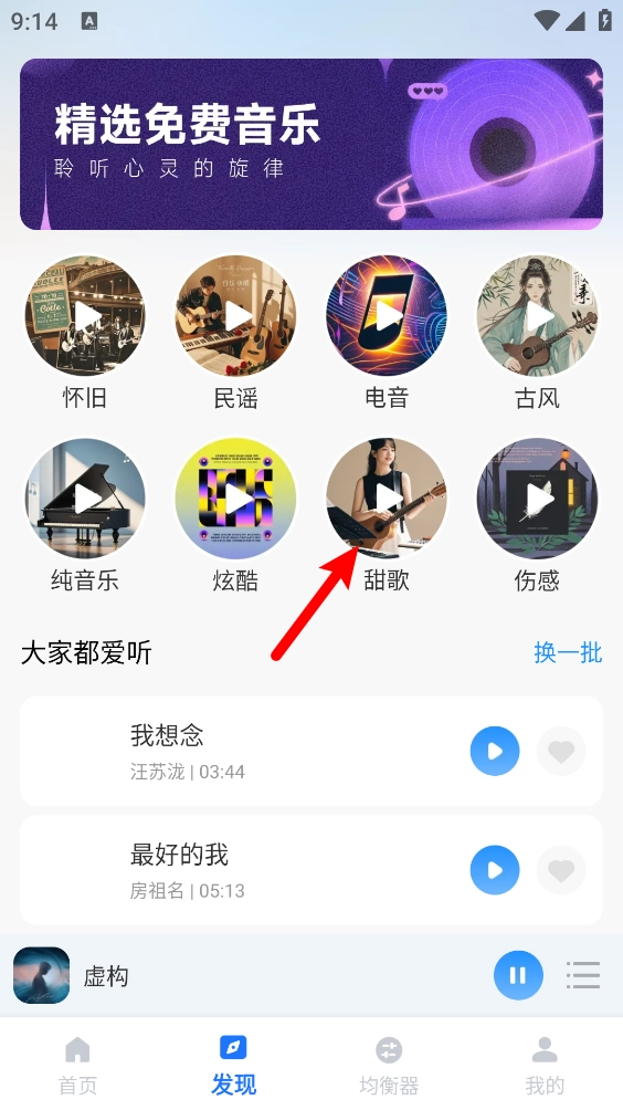2、进入首页后点击"发现",根据分类或滑动选择所需的歌曲。