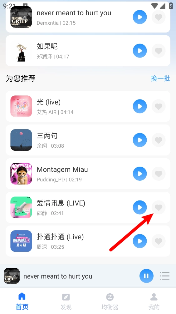 1、启动软件后,在主页找到想要收藏的歌曲,点击歌曲右侧的小爱心图标就能完成收藏。
