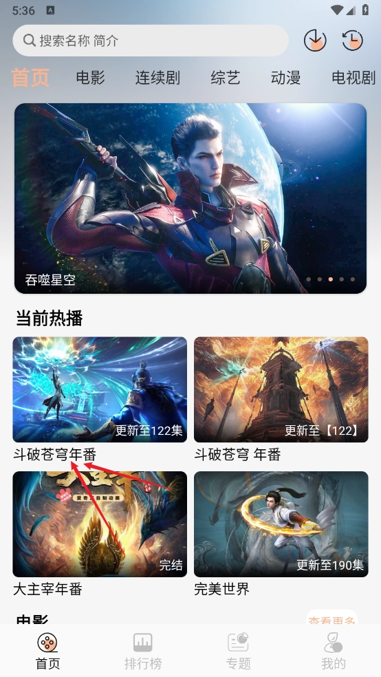 1、点击搜索框,输入想要投屏的剧集。