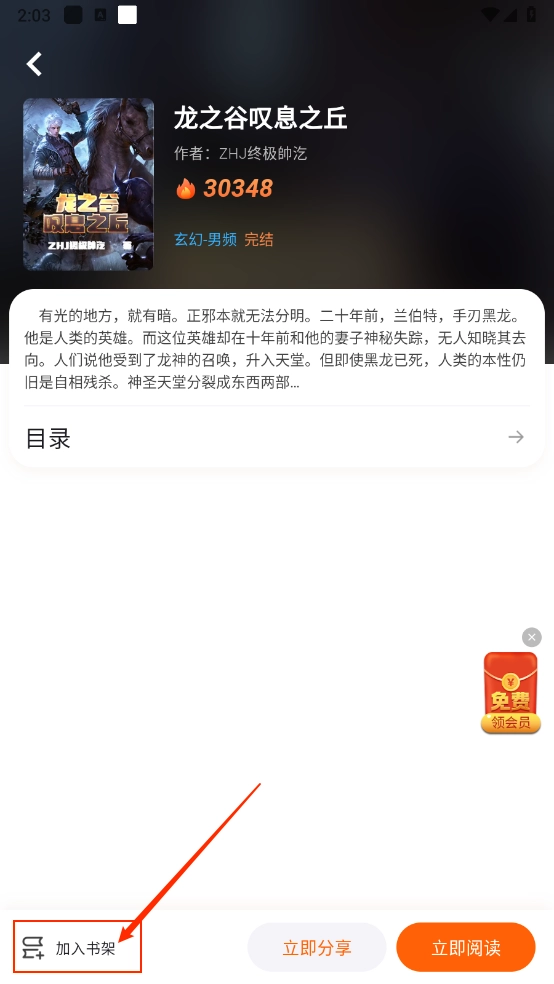 2、进入小说详情页,点击"加入书架"即可。