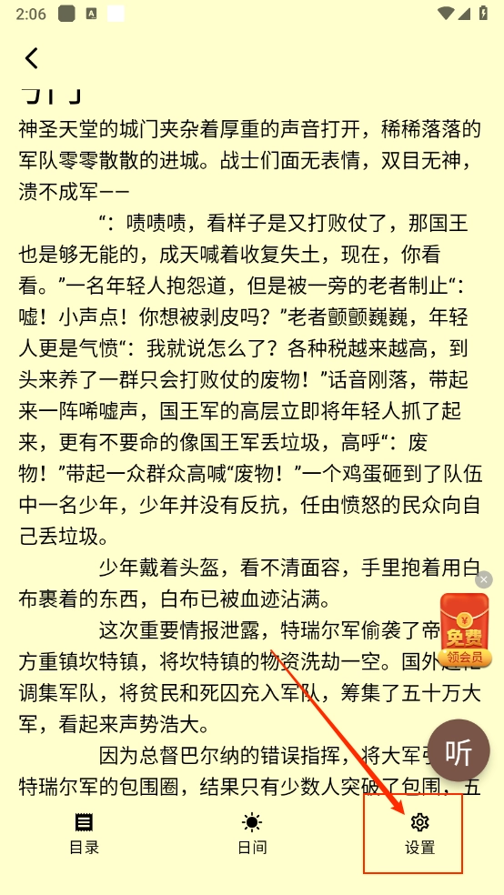 2、然后在阅读界面点击中间区域呼出菜单,点击"设置"。