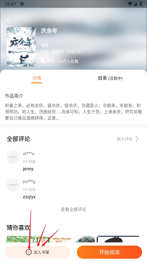 2、这里以"庆余年"为例,一键打开进入详情页面,点击"加入书架"。