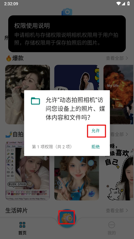 5、接着点击相机中间按钮,允许相关权限进行访问,进入后即可拍照。