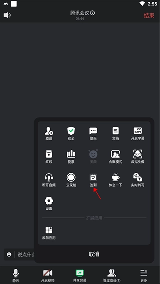 进入会议页面后,点击右下角的“更多”选项,接着选择“签到”功能进入即可。