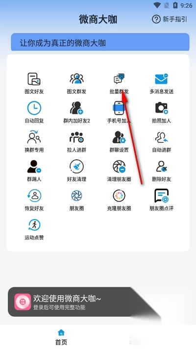 1、启动软件并进入首页后,点击“批量群发”功能按钮