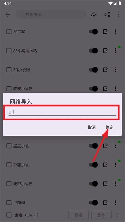 4、最后输入导入的书源地址,点击"确定"即可。