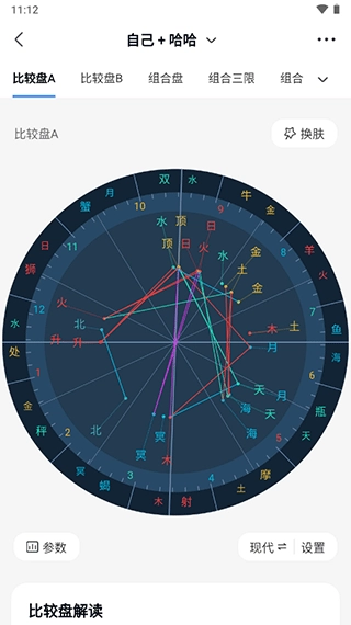 4、就能进行合盘,合盘之后即可看到自己和对方的星座参数解读等。