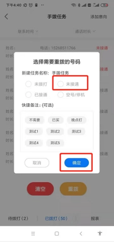 第三步:对未接通的号码进行重拨,创建任务,轻松搞定。