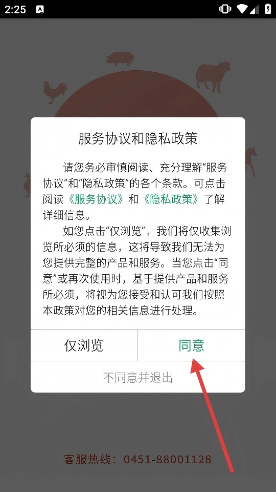 1、首次打开,仔细阅读【服务协议】和【隐私政策】后,点击【同意】,进入主界面。