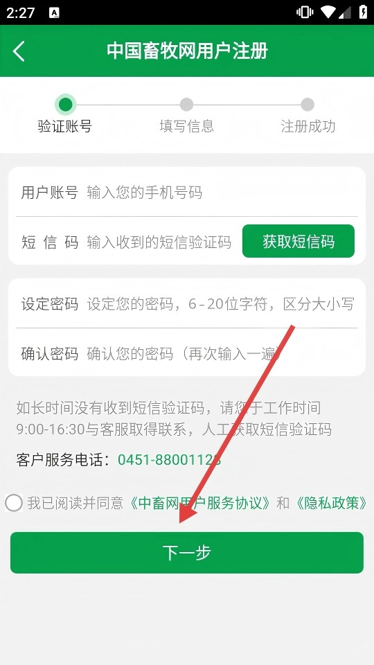 4、在【中国畜牧网用户注册】页面,填写相关信息,勾选同意相关协议后,点击【下一步】,继续完成注册。