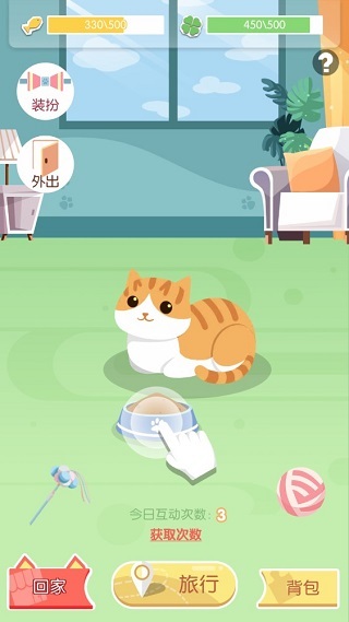 5、“回到“家”后就能撸猫啦,这段时间里你可以选择让宠物外出玩耍,也能消耗钻石或服装碎片给小猫咪装扮一番,不过别忘了要喂养它哦——幸运值越高,猫咪外出玩耍时带回来的物品就会越好呢~