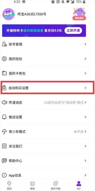 2、接着找到“自动购买设置”,找到对应的自动购买漫画并取消就可以了。