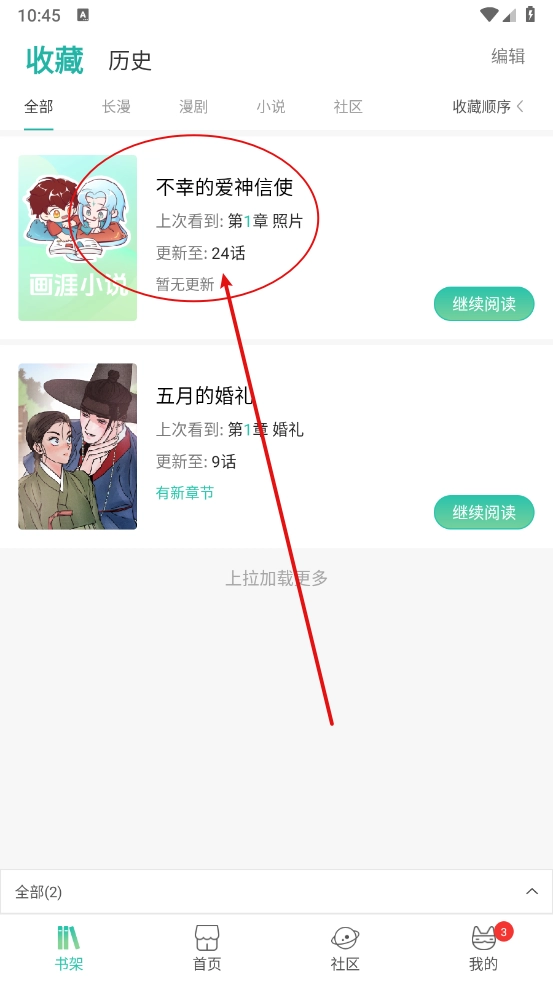 3、返回后进入“书架”板块,就能看到已收藏的目标漫画了。