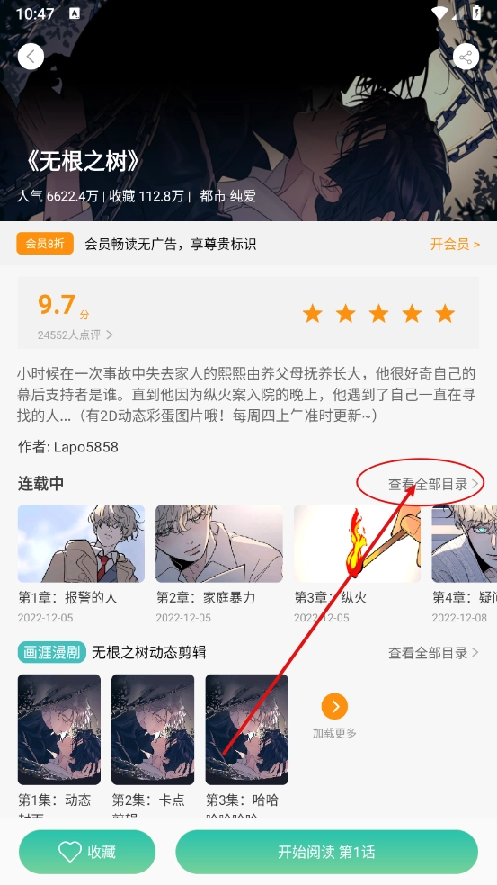 1、进入喜欢的漫画详情页,点击"查看全部目录"。