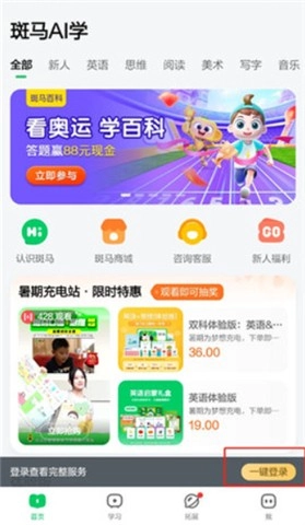1、打开斑马英语,进入首页后点击右下角的“一键登录”。