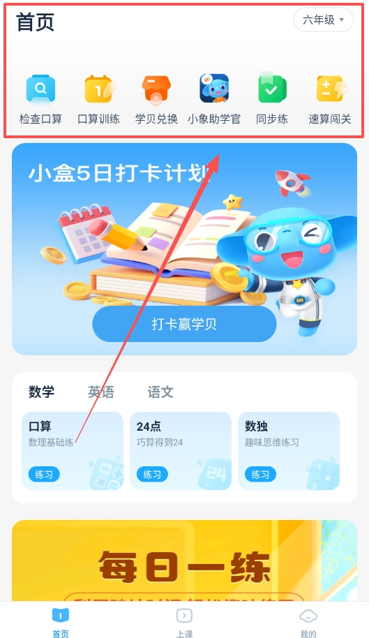 2、接下来可以探索首页的学习功能,在六年级主页能找到检查口算、口算训练等核心工具,每日一练模块也记得要打卡哦。