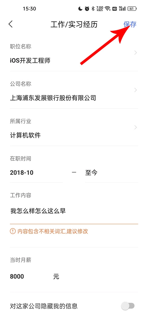 5、点击进入编辑界面,把职位名称、公司名称、所属行业、工作内容等信息修改完毕后,点击右上角的按钮就能完成保存操作了。