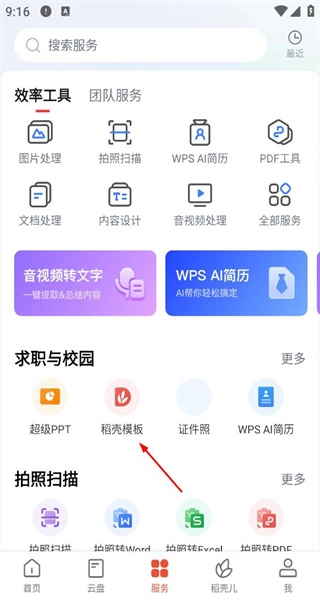 1、启动软件后,进入服务页面,这里会呈现效率工具等功能分类,接着点击求职与校园板块下的稻壳模板,即可进入模板选择界面。