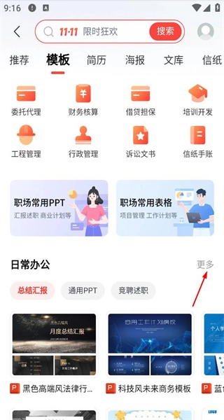 2、在稻壳模板界面,选择日常办公分类的更多选项,进入日常办公模板列表页面。