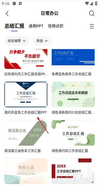 在日常办公模板列表页面,挑选简洁蓝色的工作总结汇报PPT模板,然后进入该模板的详情页面。
