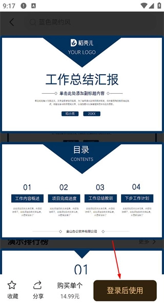 4、在模板详情页面,查看模板内容后,点击登录后使用按钮,准备登录并使用该模板。