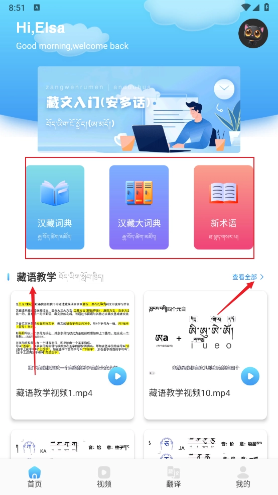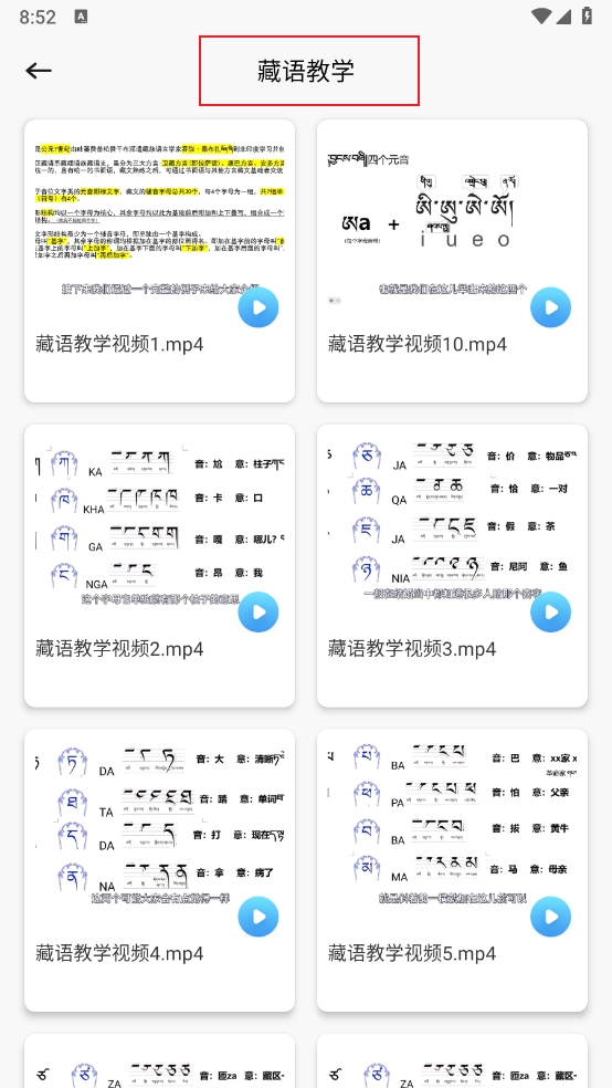 3、点击“藏语教学”右侧的“查看全部”进入,如图所示,里面有多个教学视频,可点击打开进行学习。