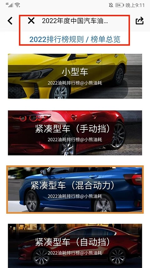 3、进入油耗排行榜界面,该界面涵盖【小型车】、【紧凑型车】、【中型车】、【中大型车】、【MPV】等各类车型,下面以【中大型车】为例进行说明。