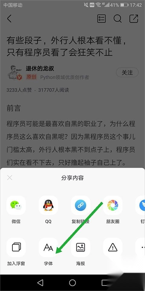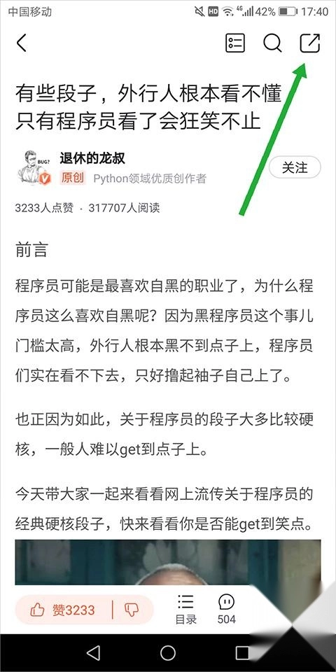 用户打开,找到任意一篇文章,点击右上角分享按钮(下图绿色箭头所指)